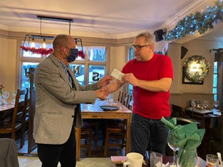 We were entertained by Dean who sang seasonal songs and engaged us all with a quiz and his jokes. Dean works at The Great Ormond Street Hospital and is a source of great inspiration to us all. Spencer Bunce, on behalf of all our neighbours, handed a donation for The Great Ormond Street Hospital to Dean.